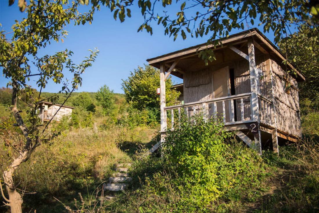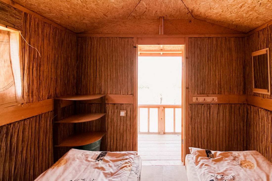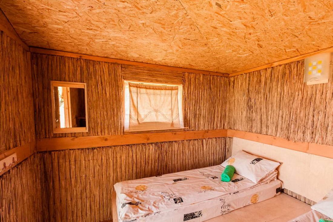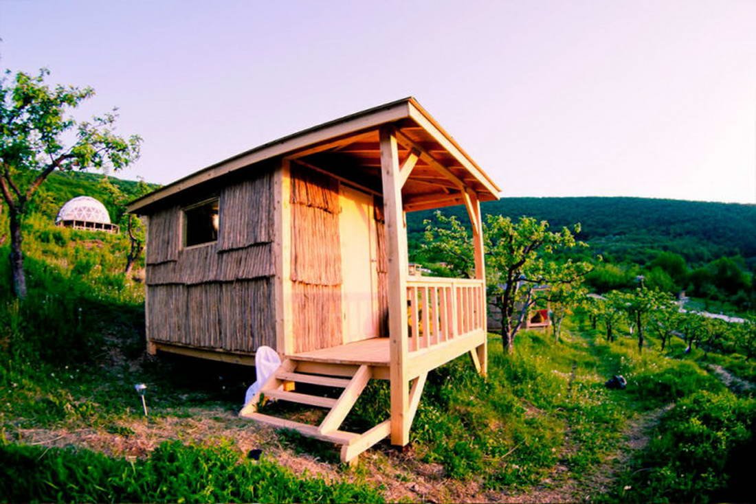 Двухместный эко-бунгало из природных материалов, расположенный в яблоневом саду. Внутри есть розетки, свет, а также полки для вещей. Предоставляется постельное белье.