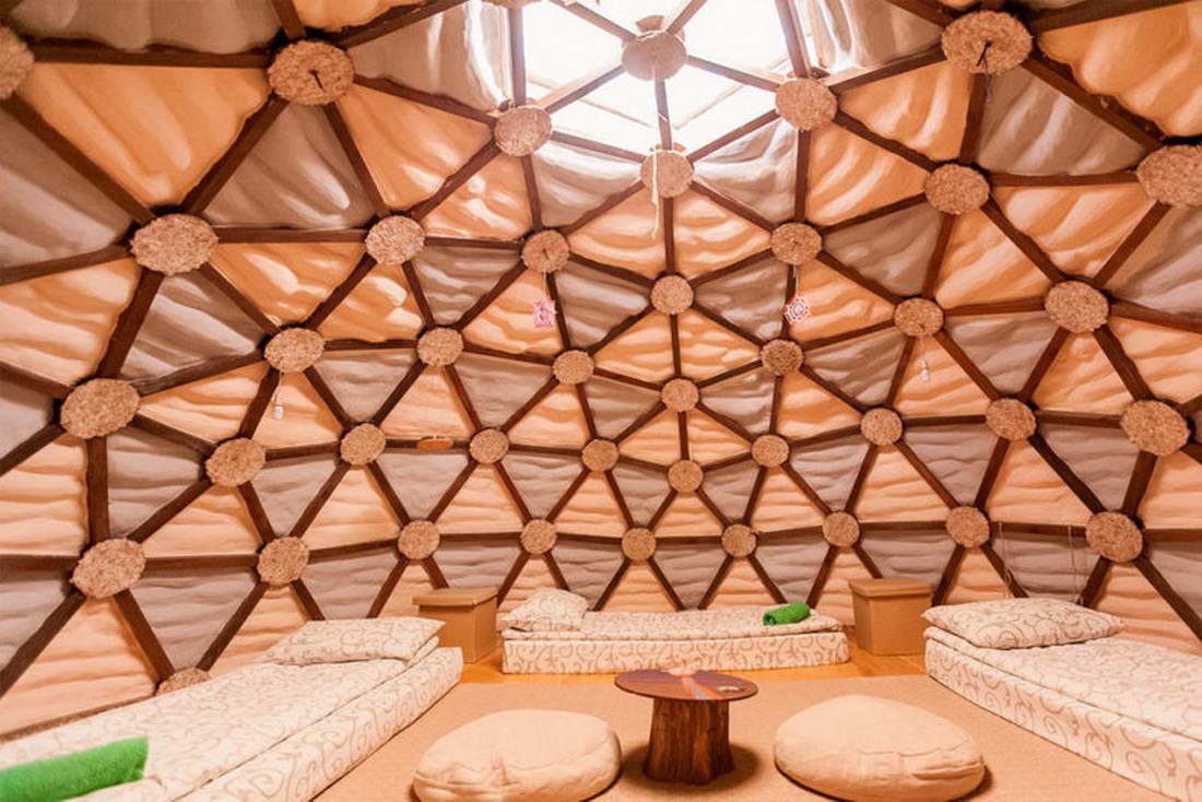 Зал на 50 человек слушателей и 25 человек активно занимающихся йогой. Оболочка сферы при необходимости открывается или закрывается.